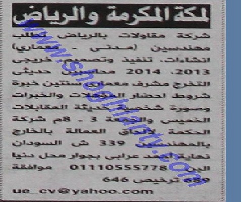 تعلن شركة مقاولات بعاصمة المملكة العربية السعودية "الرياض" عن حاجتها للتعاقد مع مهندسين "مدنى - ومعمارى"، خريجى 2013، 2014، وكذلك محاسبين حديثى التخرج، ومشرف معمارى.