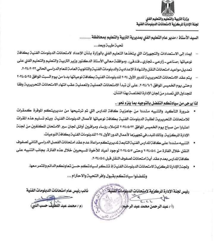 - التنبية والتشديد على كافة المدارس الفنية التابعة بالمديريات التعليمية لمراعاة عدم عقد امتحانات الفصل الدراسي الثاني لصفوف النقل خلال الفترة من 4-5-2024 حتى 7-5-2024 لوجود أعياد للأخوة المسيحين خلال هذه الفترة بجانب التنبية على كافة المدارس بعدم عقد إية انتحانات لصفوف النقل قبل 4-5-2024.