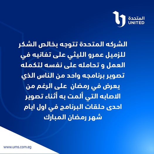 كما وجهت الشركة المتحدة بالشكر الى الأعلامى عمرو الليثى عبر صفحتها الرسمية، قائلة الشركة المتحدة تتوجه بخالص الشكر للزميل عمرو الليثى على تفانيه فى العمل وتحامله على نفسه لتكملة تصوير برنامجه واحد من الناس الذى يعرض فى رمصان على الرغم من الأصابة التى ألمت به أثناء تصوير أحدى حلقات البرنامج فى أول ايام شهر رمضان المبارك