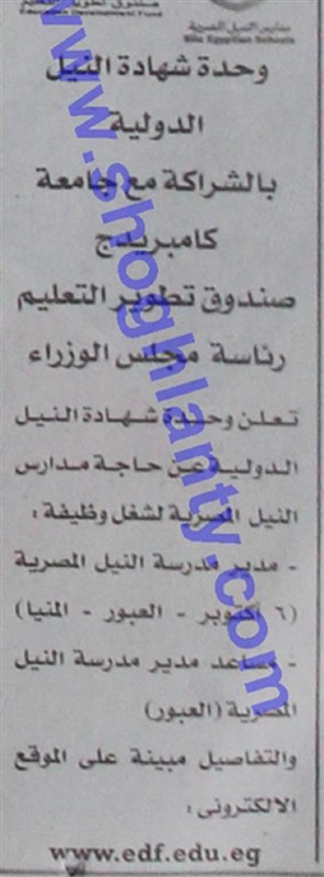 تعلن مدارس النيل المصرية الحكومية عن وظائف شاغرة للمعلمين وذلك في التخصصات التالية: