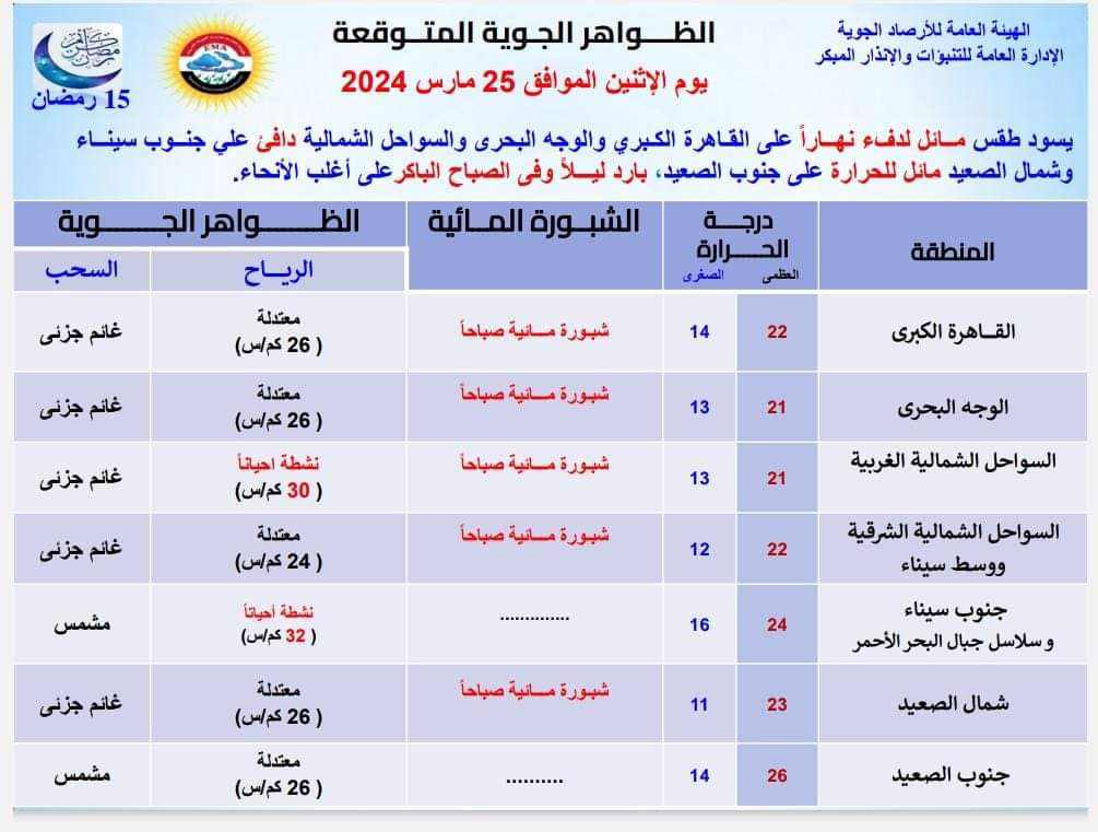 إليكم ملخصًا لما جاء من التوقعات الخاصة بـ حالة الطقس اليوم الاثنين: