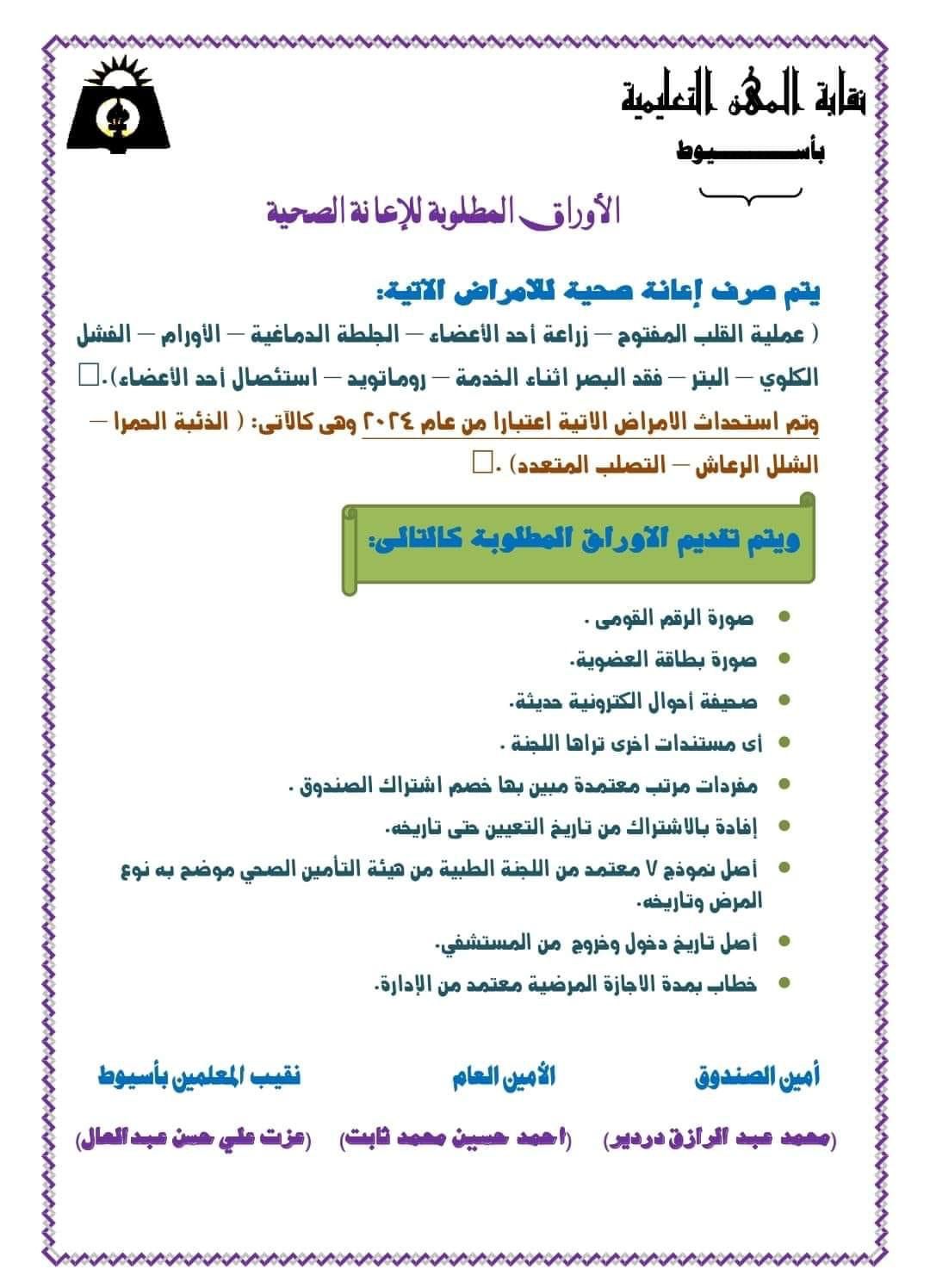 الأوراق المطلوبة للإعانة الصحية في نقابة المهن التعليمية بأسيوط
