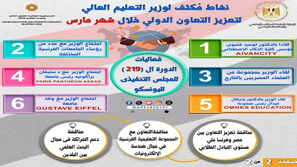 شهد شهر مارس نشاط مكثف لـ وزير التعليم العالي والبحث العلمي فى مجال التعاون الدولى، في إطار مبدأ المرجعية الدولية، وتطبيق الإستراتيجية الوطنية للتعليم العالي والبحث العلمي، بهدف دعم تنافسية المنظومة التعليمية المصرية، وتعزيز العلاقات الدولية فى مجال التعليم العالى والبحث العلمى مع الأشقاء من الدول العربية والإفريقية، وتبادل الخبرات مع الدول العالمية.