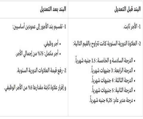 وإليكم التعديلات في بند الأجور طبقاً لللائحة التنفيذية الجديدة لقانون الخدمة المدنية: