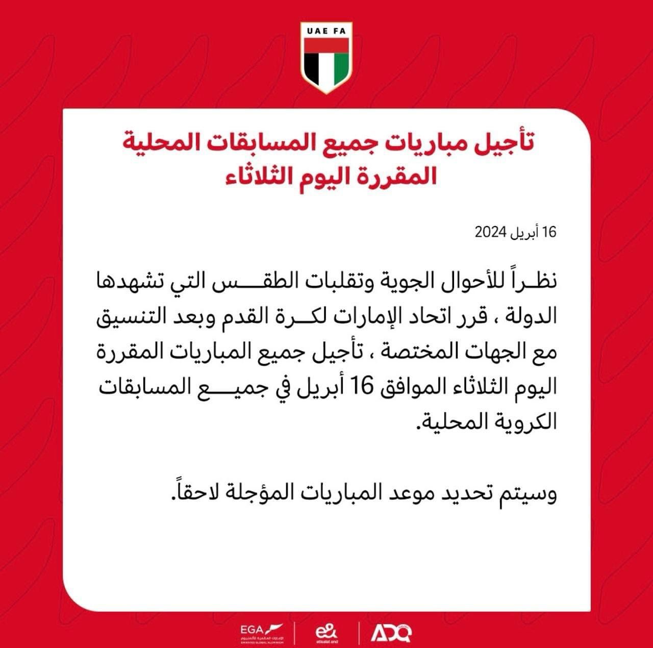 قرر اتحاد الكرة الإماراتي (اتحاد الإمارات لكرة القدم)، وبعد التنسيق مع الجهات المختصة، تأجيل جميع المباريات المقررة اليوم الثلاثاء الموافق 16 أبريل في جميع المسابقات الكروية المحلية، وسيتم تحديد موعد المباريات المؤجلة لاحقًا وذلك نظرًا للأحوال الجوية وتقلبات الطقس التي تشهدها الدولة.