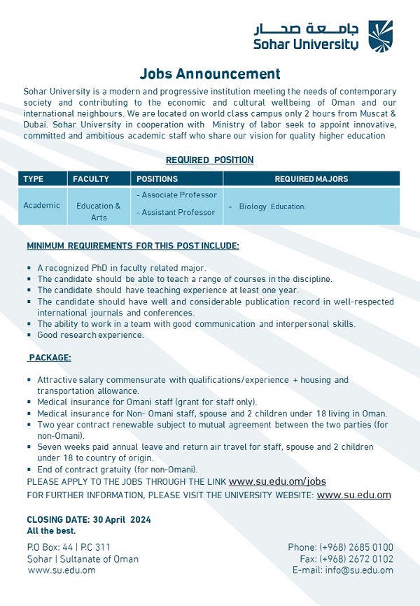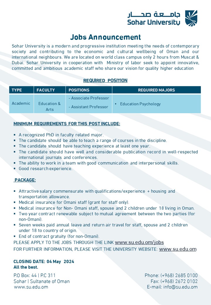 تعلن جامعة صحار بدولة سلطنة عمان، عن حاجتها إلى أعضاء هيئة تدريس من مساعد الاستاذ وأسيس بروفيسير في كلية التربية والفنون بـ جامعة صحار، وعلى الراغبين في الحصول على وظائف جامعة صحار، الدخول على موقع جامعة صحار والتقديم الآن على موقع جامعة صحار عبر شبكة الانترنت.