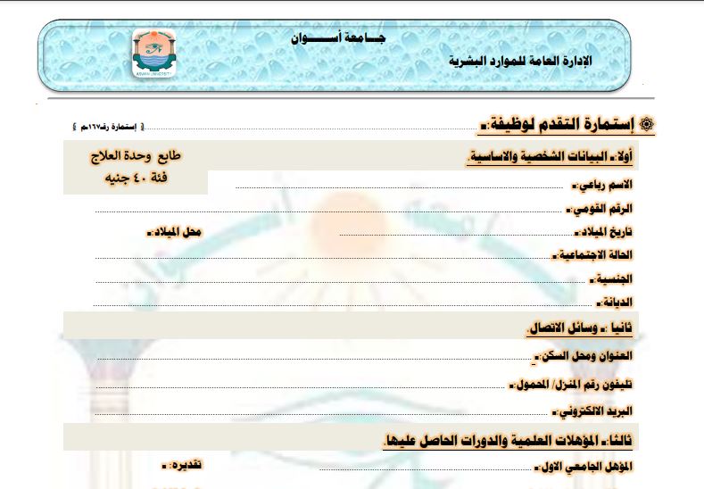 على راغبي التقدم لوظائف جامعة أسوان استيفاء النوذج المعد لهذا الغرض بالأمانة الفنية للجنة القيادات علي أن يقدم الطلب باسم الدكتور رئيس جامعة أسوان مستوفي الدمغة والمستندات المطلوبة على ان تسلم باليد، ولن يلتفت الى الطلبات السابق تقديمها قبل تاريخ نشر الإعلان أو بعد انتهاء تاريخ النشر أو التي ترد بالبريد وتقبل الطلبات سواء كان المتقدم من جامعة أسوان أو من خارج جامعة أسوان. المزيد من التفاصيل علي موقع جامعة أسوان، من خلال الدخول على هذا الرابط.. اضغط هنااااااااااااااا