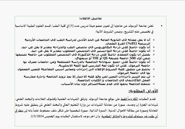 الأوراق المطلوبة في وظائف جامعة اليرموك