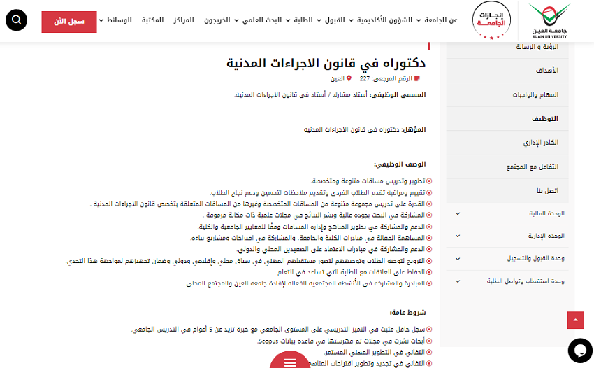 وظيفة جامعه .. تعلن جامعة العين في دولة الإمارات العربية المتحدة عن وظائف أعضاء هيئة تدريس في تخصص دكتوراه في قانون الاجراءات المدنية وفقا لنص الإعلان المنشور علي الموقع الرسمي للجامعة