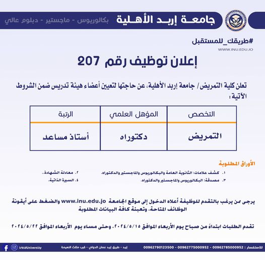 تعلن جامعة إربد، بالمملكة الأردنية الهاشمية، عن حاجتها إلى أعضاء هيئة التدريس ومعاونيهم، وعلى الراغبين في الحصول على وظائف جامعة إربد، التواصل من خلال موقع جامعة إربد، علما بانه قد تم نشر هذا الإعلان على موقع جامعة إربد الرسمي عبر موقع شبكة الانترنت، علما بان آخر موعد للتقديم هو مساء اليوم الأربعاء الموافق 22-5-2024.
