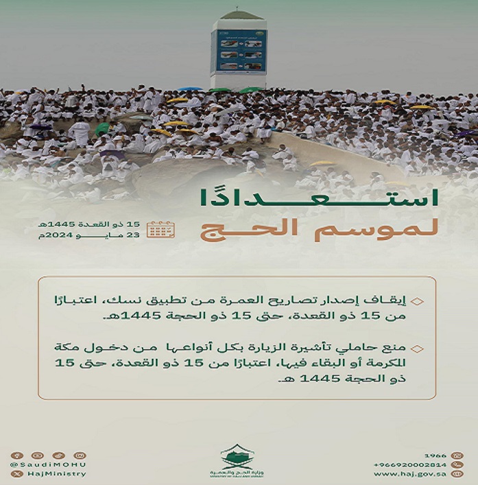 أعلنت وزارة الحج والعمرة عبر حسابها على شبكات التواصل الاجتماعي عن قرار بمنع حملة تأشيرات الزيارة بجميع أنواعها من دخول مكة المكرمة أو البقاء فيها، اعتبارًا من 15 ذو القعدة حتى 15 ذو الحجة لعام 1445 هجرية. القرار يهدف إلى تخصيص الدخول لحملة تأشيرات الحج فقط، لتسهيل أداء المناسك بيسر للحجاج النظاميين.