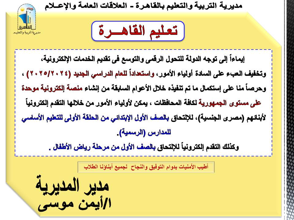 بشأن كل ماتريد معرفته عن تفاصيل تقديم رياض الاطفال والصف الأول الابتدائي للعام الدراسي الجديد (2024/2025)،أعلنت مديرية التربية والتعليم بالقاهرة، برعاية أيمن موسى، وكيل أول الوزارة - مدير المديرية، أنه في إطار خفض العبء على أولياء الأمور واستعدادًا للعام الدراسي القادم، وتنفيذًا لمنصة إلكترونية موحدة على مستوى الجمهورية لتسهيل عملية تقديم رياض الاطفال والصف الأول الأبتدائى في جميع المحافظات. الآباء والأمهات بإمكانهم التقديم الإلكتروني لأبنائهم المصريين للانضمام إلى الصف الأول الابتدائي منذ الحلقة الأولى للتعليم الأساسي في المدارس الرسمية. كما يمكنهم أيضًا تقديم رياض الاطفال بنظام الكتروني، وبناءً على ما سبق، يتم التنبيه إلى الالتزام بالإجراءات التالية: