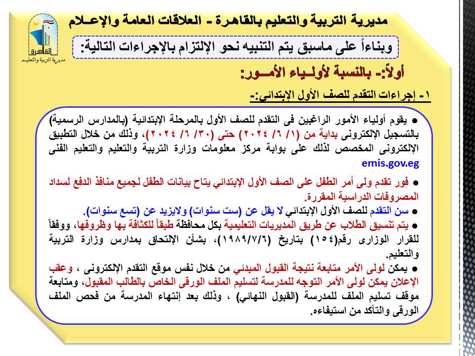يجب على أولياء الأمور الذين يرغبون في تسجيل أبنائهم في الصف الأول من التعليم الابتدائي بالمدارس الرسمية أن يبدأوا عملية التسجيل الإلكتروني من تاريخ 1 يونيو 2024 وحتى 30 يونيو 2024، عبر التطبيق الإلكتروني المخصص على بوابة مركز معلومات وزارة التربية والتعليم والتعليم الفني emis.gov.eg.