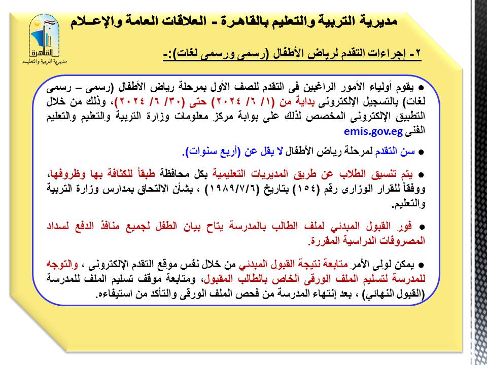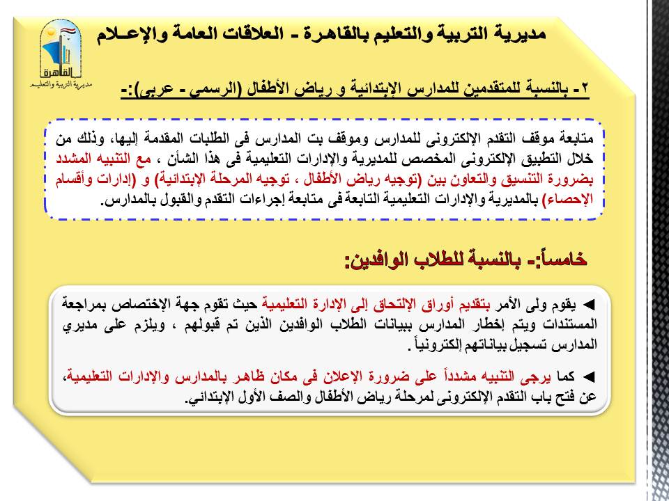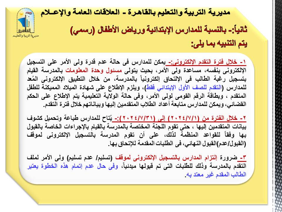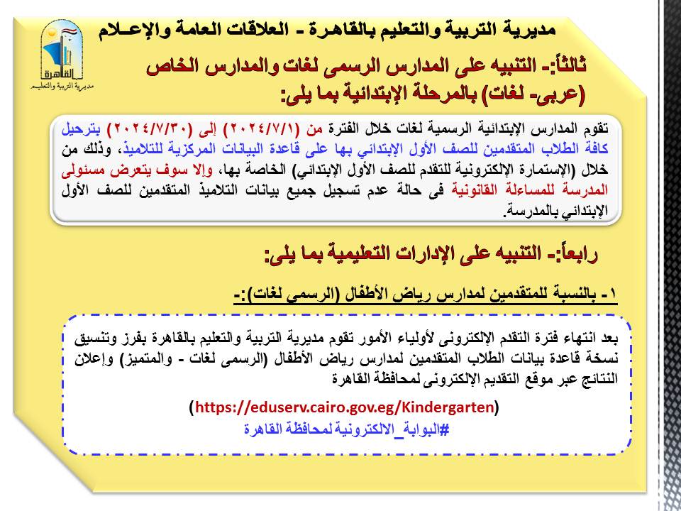 - يُرجى التنبيه بشكل مشدد على ضرورة إعلان فتح باب التقدم الإلكتروني لمرحلة تقديم رياض الاطفال والصف الأول الابتدائي في مكان ظاهر بالمدارس والإدارات التعليمية.