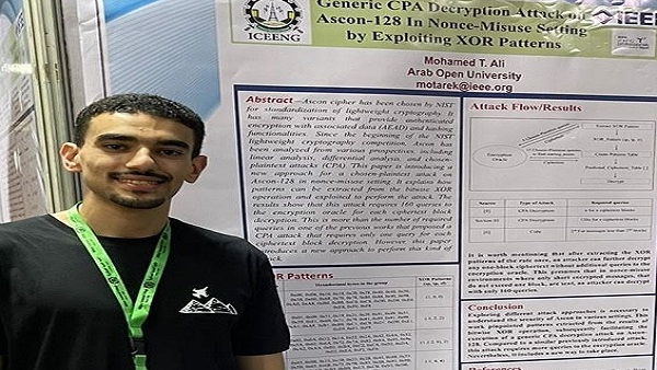 تناولت ورقة البحث التي قدمها الطالب محمد طارق علي، بـ الجامعة العربية المفتوحة، بعنوان "Generic CPA Decryption Attack on Ascon-128 in Nonce-Misuse Setting by Exploiting XOR Patterns" دراسة تحليلية لأحدث خوارزميات تشفير البيانات، وحظيت باهتمام كبير من قبل المشاركين في المؤتمر، نظرًا لأهميتها وعمق مضمونها العلمي.