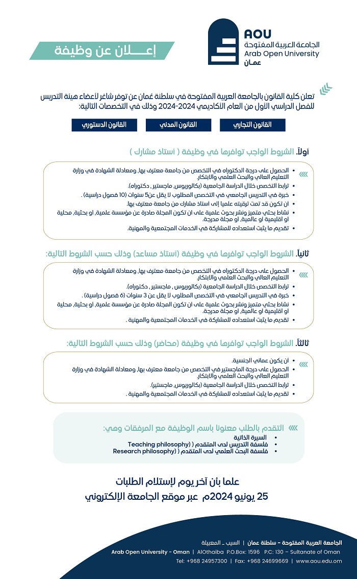 تعلن الجامعة العربية المفتوحة بسلطنة عمان عن حاجتها إلى أعضاء هيئة تدريس من أساذ مشارك وأستاذ مساعد ومحاضر، وعلى الراغبين في الحصول على وظائف الجامعة العربية المفتوحة الدخول على موقع الجامعة العربية المفتوحة للتقديم عبر شبكة الانترنت.