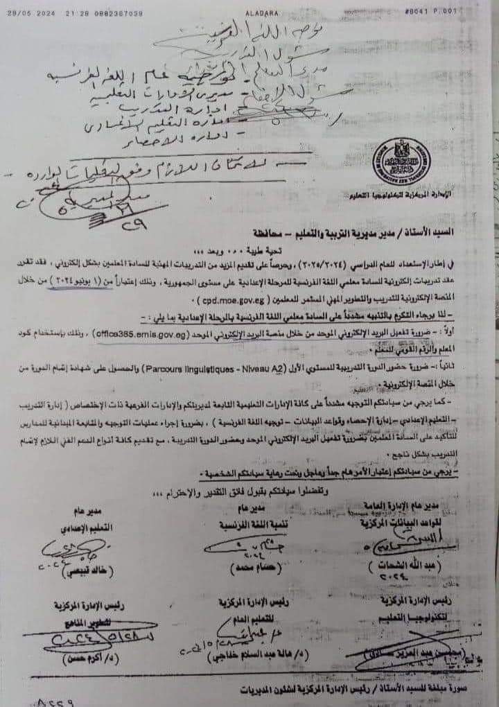 تدريب معلمى اللغة الفرنسية من بداية شهر يونيو على المنهج الجديد للصف الأول الإعدادي الذى سيدرس العام الدراسي ٢٠٢٥/٢٠٢٤ وذلك وفقا لما جاء في خطاب وزارة التربية والتعليم للمديريات التعليمية