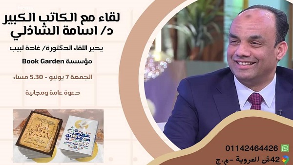 في السياق ذاته، تقيم مكتبة مصر الجديدة العامة التابعة إلى جمعية مصر الجديدة لقاءً مفتوحًا مع الكاتب الدكتور أسامة عبد الرؤوف الشاذلي، يوم الجمعة في الساعة الخامسة مساءً.