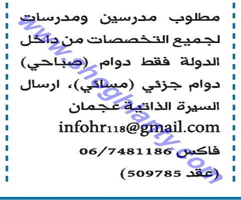 تعلن مدرسة خاصة بدولة الامارات العربية المتحدة عن حاجتها للتعاقد مع معلمين ومعلمات من داخل الدولة دوام (صباحي) دوام جزئي(مسائي).