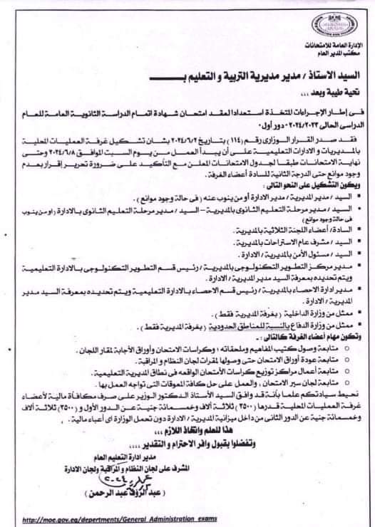 وزير التربية والتعليم.. على أن يتم صرف 3500 جنيه لكل عضو من أعضاء غرفة عمليات الثانوية العامة 2024، عن الدور الاول، بالاضافة الى صرف 3500 جنيه لكل عضو من أعضاء غرفة عمليات الثانوية العامة 2024 في الدور الثاني.