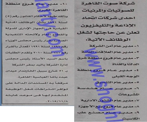 تعلن شركة القاهرة للصوتيات والمرئيات، إحدى شركات اتحاد الاذاعة والتليفزيون، عن حاجتها لمديرى عموم للأمن والعلاقات العامة وفروع منطقة شرق الدلتا والقناة ومنطقة الوجه القبلى وهندسة مشروعات، وعلى الراغبين فى التقدم تسليم الطلبات باليد فى مقر الشركة بـ 51 شارع سبيل الخازندار، ميدان عبده باشا، العباسية، القاهرة.