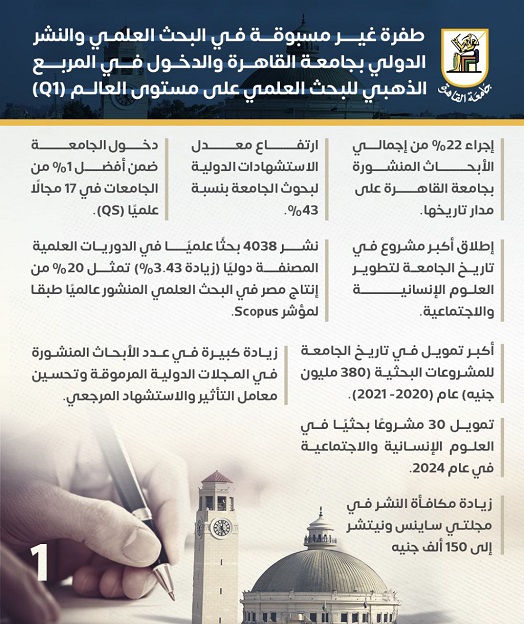 جامعة القاهرة استمرت في تصدرها للجامعات والمراكز البحثية في مصر بعدد الأبحاث المنشورة دوليًا وفقًا لمؤشر البحث العلمي في قاعدة بيانات "SCOPUS"، حيث بلغ معامل تأثير الاستشهادات 1.32، وهو من أعلى المعدلات العالمية في هذا المجال. بالإضافة إلى ذلك، قدمت الجامعة حوالي 268 مشروعًا ابتكاريًا وبراءة اختراع، ونفذت 251 مشروعًا بالتعاون مع جهات مختلفة في مجال البحث العلمي، بالإضافة إلى 7 مشاريع داخل الجامعة و4 مشاريع دولية، بتكلفة إجمالية للبحوث تقدر بنحو 80 مليون جنيه.
