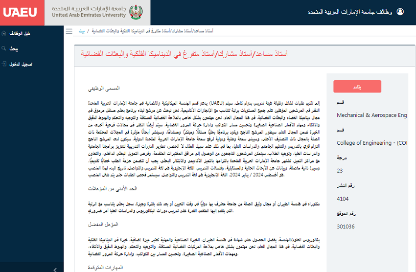 وظيفة جامعة.. أعلم قسم الهندسة الميكانيكية والفضائية في جامعة الإمارات العربية المتحدة عن وظائف أعضاء هيئة تدريس في تخصص أستاذ مساعد/أستاذ مشارك/أستاذ في ديناميكا الفضاء والبعثات الفضائية بدوام كامل وفقا لنص الإعلان التالي: