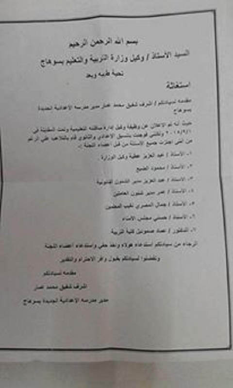 وطالب الاتحاد وكيل الوزارة الحالى عبدالجواد عبدالعال أحمد ابراهيم، بحل تلك المشكلة والتحقيق فيها بمساعدة وكيلة المديرية سنية عز الدين أحمد.