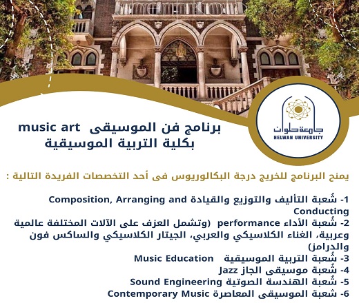 برنامج فن الموسيقى (Music Art) في كلية التربية الموسيقية بجامعة حلوان يُمنح للخريجين درجة البكالوريوس في عدة تخصصات فريدة، منها: