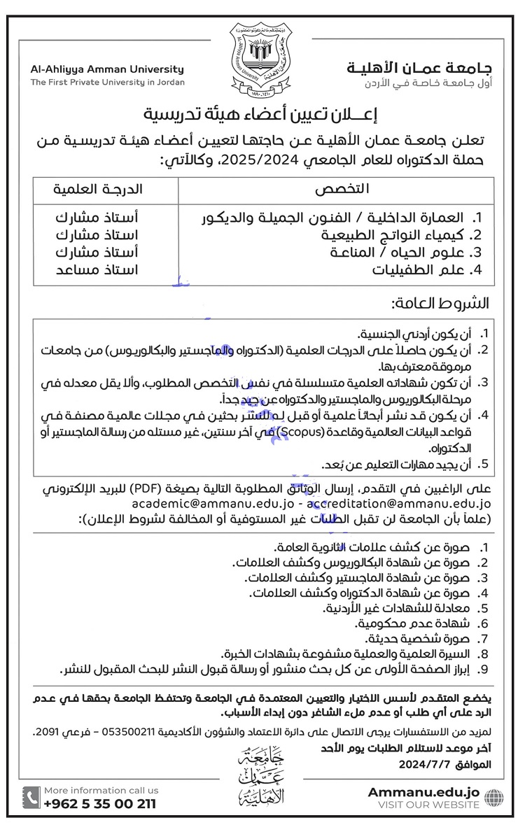يخضع المتقدم لاسس الاختيار والتعيين المعتمدة في جامعة عمان الأهلية وتحتفظ جامعة عمان الأهلية بحقها في عدم الرد على اي طلب أو عدم ملء الشاغر دون إبداء الأسباب، ولمزيد من الاستفسارات يرجى الاتصال على دائرة الاعتماد والشؤون الاكاديمية 053500211 - فرعي 2091، علما بأن آخر موعد للاستلام الطلبات يوم الأحد الموافق 7-7-2024