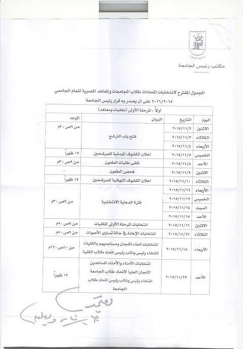 اعتمد الدكتور جابر نصار، رئيس جامعة القاهرة، مواعيد انتخابات مجالس اتحادات طلاب كليات الجامعة، ومجلس اتحاد طلاب الجامعة للعام الجامعي ١٠١٥. / ٢٠١٦.