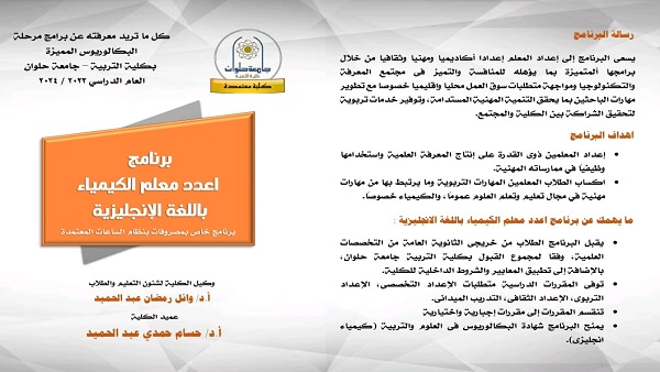 كلية التربية جامعة حلوان تكشف عن برنامج إعداد معلم الكيمياء باللغة الإنجليزية