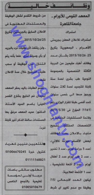 يعلن المعهد القومي للأورام بجامعة القاهرة عن حاجته للتعاقد مع أطباء من خريجى كلية الطب جامعة القاهرة بتقدير جيد على الاقل فى البكالوريوس وتقدير جيد جدا فى مادة التخصص وامضى مدة الامتياز والايكون قد مضى على انهاء الامتياز اكثر من عامين وذلك وفقا للشروط التالية :