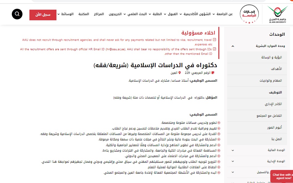 المسمى الوظيفي في إعلان جامعة العين الإماراتية: