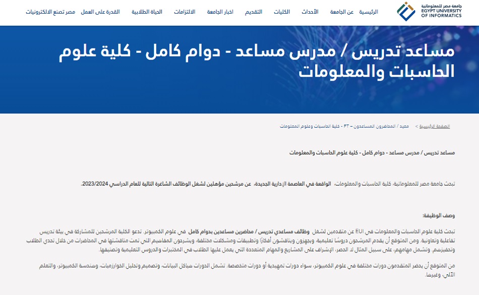 تبحث جامعة مصر للمعلوماتية، كلية الحاسبات والمعلومات، الواقعة في العاصمة الإدارية الجديدة، عن مرشحين مؤهلين لشغل الوظائف الشاغرة التالية