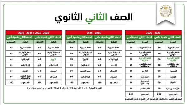 أوضحت الوزارة أن طلاب الصف الثاني الثانوي العام سيدرسون المواد التالية حسب قرارات وزير التربية والتعليم: اللغة العربية، اللغة الأجنبية الأولى، الفيزياء، الكيمياء، الأحياء، والرياضيات للشعبة العلمية. أما طلاب الشعبة الأدبية، فسيشمل المنهج مواد اللغة العربية، اللغة الأجنبية الأولى، التاريخ، علم النفس، الجغرافيا، والرياضيات.