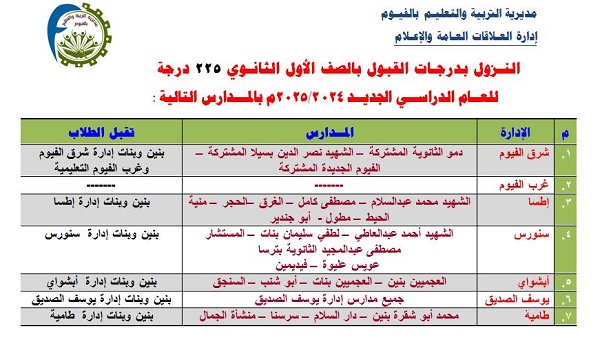 وقد تم تحديد المدارس التي يشملها القرار وفقًا للجدول المرفق الذي يوضح المدارس التي لم تستكمل كثافتها على مستوى محافظة الفيوم.