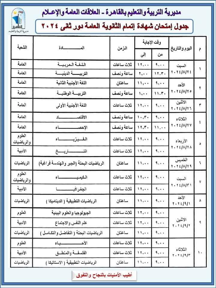جدول امتحان شهادة إتمام الثانوية العامة دور ثاني 2024