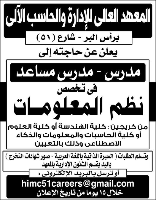 - أخبار وظائف المعهد العالي برأس البر اليوم