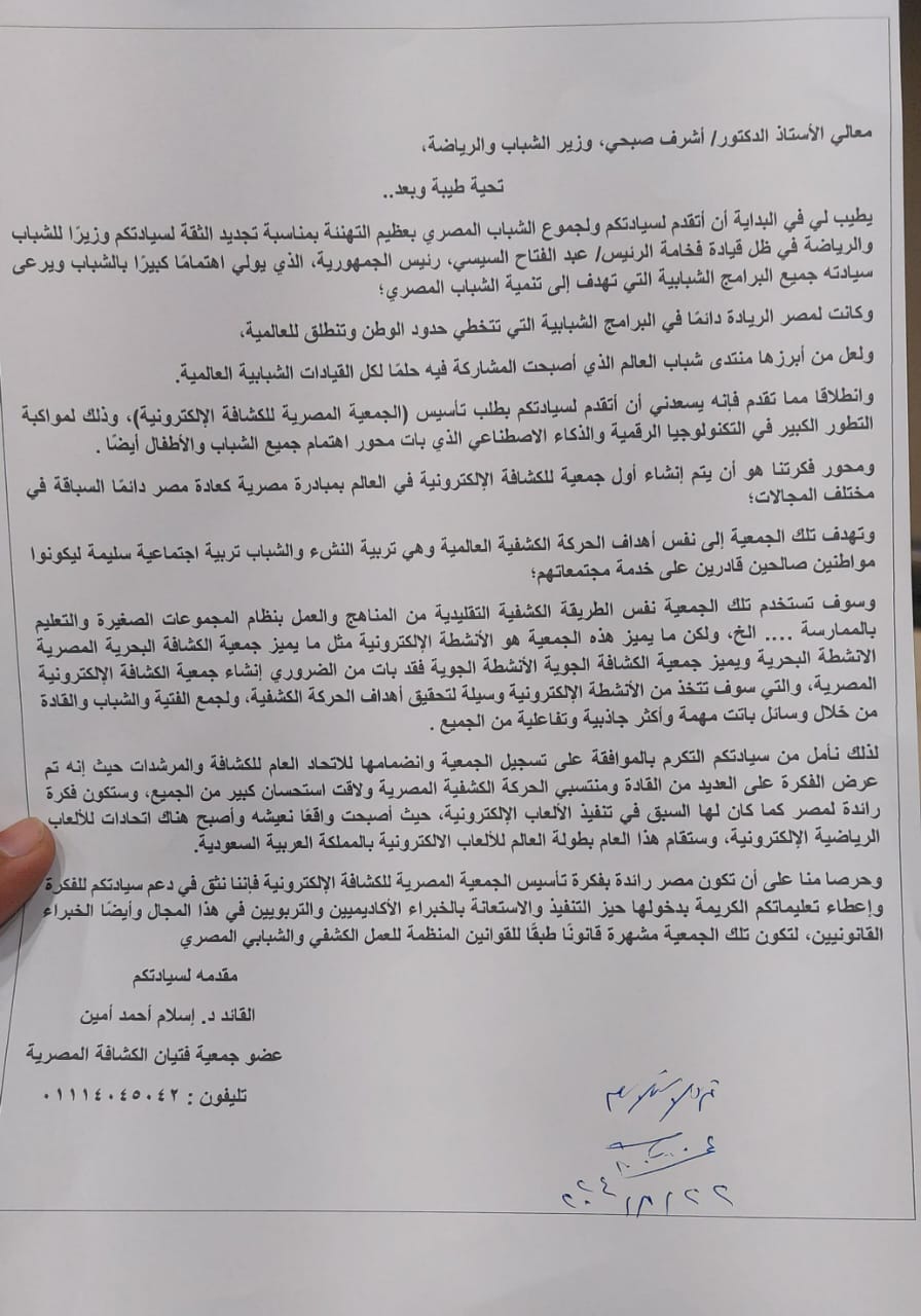 جمعية الكشافة الإلكترونية المصرية.. تقدم الدكتور إسلام امين القائد الكشفي ومؤسس مؤسسة إكرام، بفكرة جديدة إلى، بإنشاء جمعية جديدة للكشافة المصرية تحت اسم (جمعية الكشافة الإلكترونية المصرية)، بتاريخ ٢٢/٨/٢٠٢٤، وذلك لمواكبة التطورات التكنولوجية الحديثة والتي بات لزامًا علينا أن نعمل على مواكبة تلك التطورات، وخاصة وأن الدولة تشجع وتدعم كل فكرة تسهم في تنمية الشباب والمجتمع وبناء الدولة الحديثة.