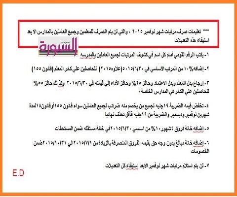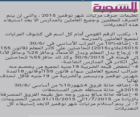 1- علاوة 10% من اساسى 30/6/2015 للحاصلين عل كادر المعلم"قانون 155 "وستضاف على اجمالى المرتب ككل كقيمة ثابتة لايترتب عليها اى زيادات اخرى فى حوافز او بدلات ..