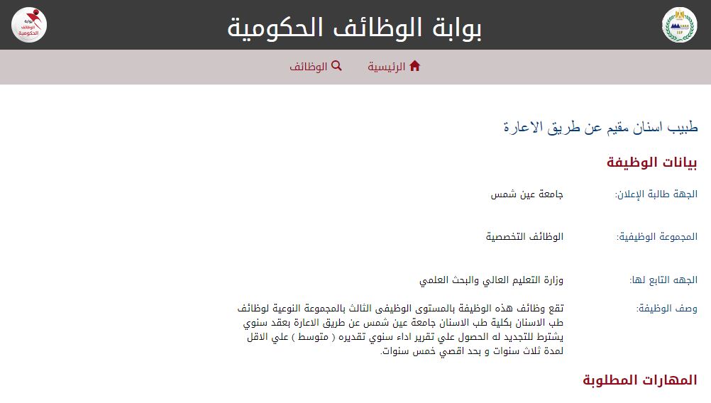 تقع وظائف هذه الوظيفة بالمستوى الوظيفى الثالث بالمجموعة النوعية لوظائف طب الاسنان بكلية طب الاسنان جامعة عين شمس عن طريق الاعارة بعقد سنوي يشترط للتجديد له الحصول علي تقرير اداء سنوي تقديره ( متوسط ) علي الاقل لمدة ثلاث سنوات وبحد اقصي خمس سنوات.