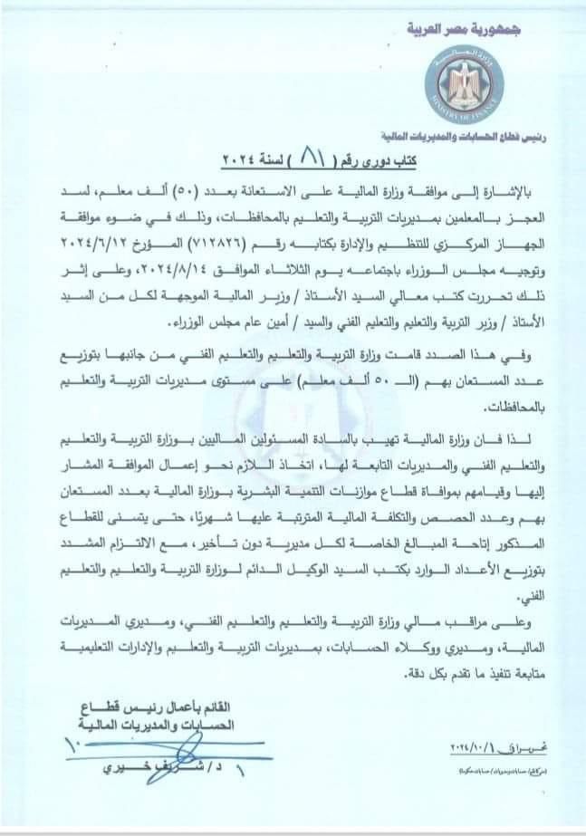 بالإشارة إلى موافقة وزارة المالية على الاستعانة بعدد ٥٠ ألف معلم، لسد العجز بالمعلمين بمديريات التربية والتعليم بالمحافظات، وذلك في ضوء موافقة الجهاز المركزي للتنظيم والإدارة بكتابه رقم (۷۱۲۸۲٦) المؤرخ ٢٠٢٤/٦/١٢ وتوجيه مجلس الوزراء باجتماعه يوم الثلاثاء الموافق ٢٠٢٤/٨/١٤.