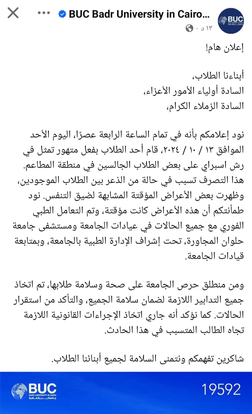 وأعلنت جامعة بدر أنه في الساعة الرابعة عصرًا من نفس اليوم، قام أحد الطلاب بفعل متهور يتمثل في رش اسبراي على بعض الطلاب الجالسين في منطقة المطاعم، مما تسبب في حالة من الذعر وظهور أعراض مؤقتة مشابهة لضيق التنفس بين بعضهم. تم التعامل الطبي الفوري مع جميع الحالات في عيادات الجامعة ومستشفى جامعة حلوان المجاورة، تحت إشراف الإدارة الطبية في جامعة بدر.