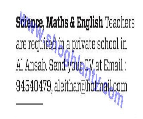 تعلن مدارس خاصة في سلطنة عمان عن وظائف شاغرة للمعلمين وذلك وفقا للشروط والتخصصات التالية: