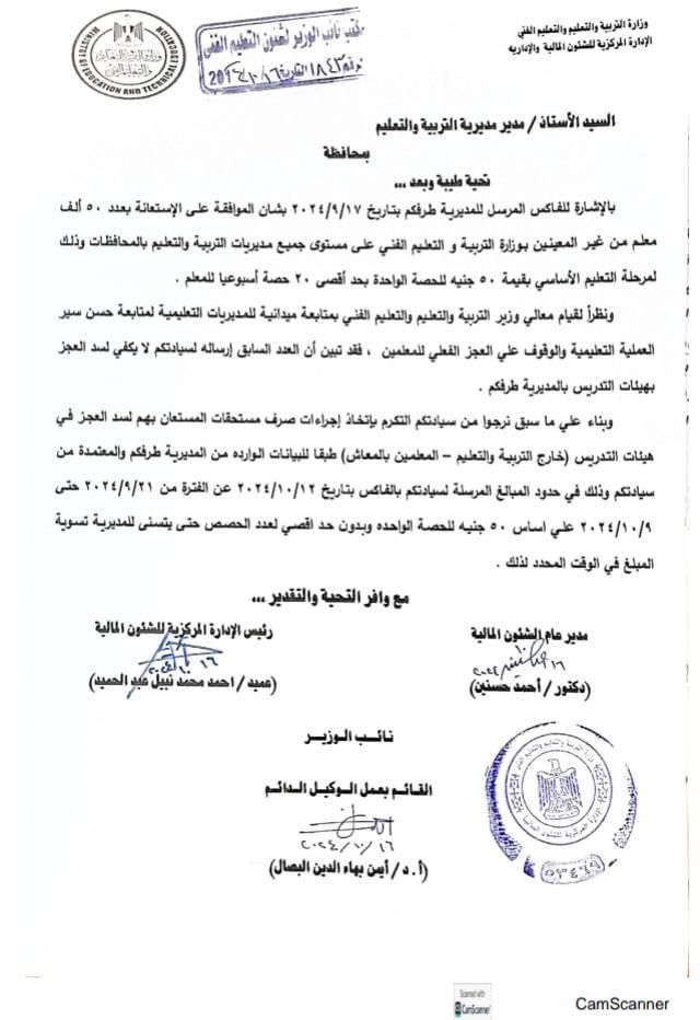 بالإشارة للفاكس المرسل للمديرية طرفكم بتاريخ ۲۰۲٤/٩/١٧ بشان الموافقة على الإستعانة بعدد ٥٠ ألف معلم من غير المعينين في وزارة التربية والتعليم الفني على مستوى جميع مديريات التربية والتعليم بالمحافظات وذلك المرحلة التعليم الأساسي بقيمة ٥٠ جنيه للحصة الواحدة بحد أقصى ٢٠ حصة أسبوعيا للمعلم.