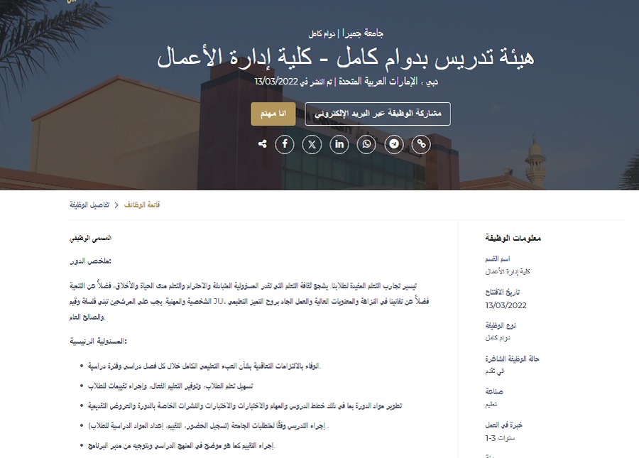 لمطالعة نص إعلان وظيفة جامعة جميرا الإماراتية والتقديم عبر الموقع الرسمي للجامعة اضغط هنا