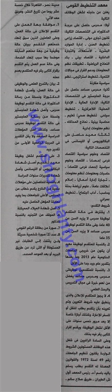 يعلن معهد التخطيط القومى عن حاجته لشغل عدد من الوظائف لاعضاء هيئة التدريس، وعلى الراغبين فى الوظيفة التقدم باسم عميد المعهد على العنوان التالى:- "شارع الطيران - طريق صلاح سالم - مدينة نصر - القاهرة"، خلال 15 يوما من تاريخ نشر الاعلان.