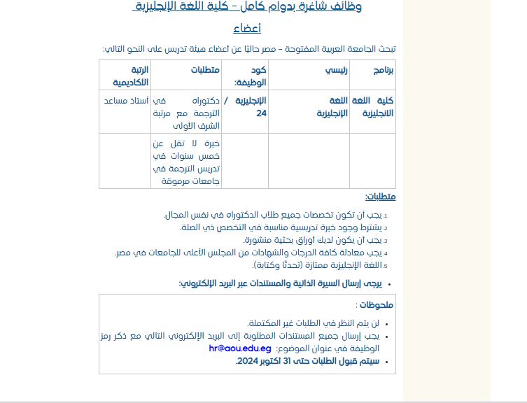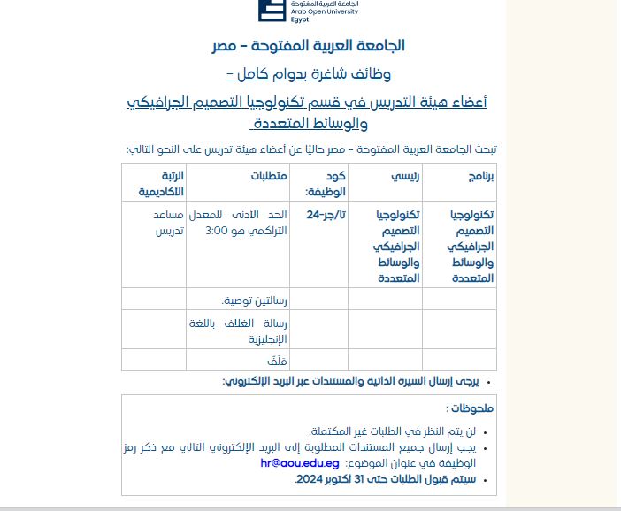 وعلى الراغبين في الحصول على وظائف الجامعة العربية المفتوحة، برجاء إرسال السيرة الذاتية والمستندات على البريد الالكتروني ولن يتم النظر في الطلبات غير المكتملة، يجب إرسال جميع المستندات المطلوبة إلى البريد الإلكتروني التالي مع ذكر رمز الوظيفة في عنوان الموضوع: [email protected] وسيتم قبول الطلبات حتى 31 أكتوبر 2024.