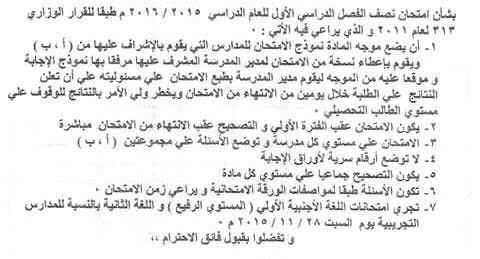 قامت وزارة التربية والتعليم وبناء على قرار رقم 313 بنشر الوصايا التى يجب اتباعها من قبل مديريات التربية والتعليم بشأن امتحان نصف الفصل الدراسى الاول للعام الحالى 2016/2015